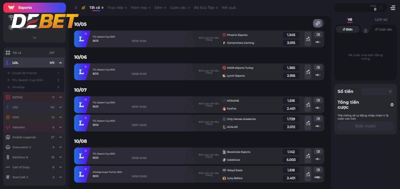 - Tỷ lệ cược cạnh tranh: Tại Debet, tỷ lệ cược trong e-Sports luôn được điều chỉnh để đảm bảo mức độ cạnh tranh và hấp dẫn nhất cho hội viên.