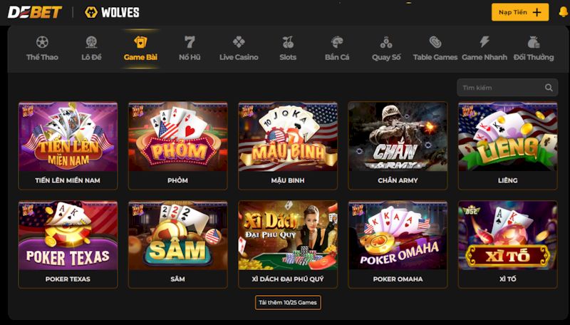 - Debet cung cấp đến cược thủ rất nhiều game bài nổi bật, phổ biến không riêng gì thị trường Việt Nam mà còn dành cho hội viên toàn cầu.