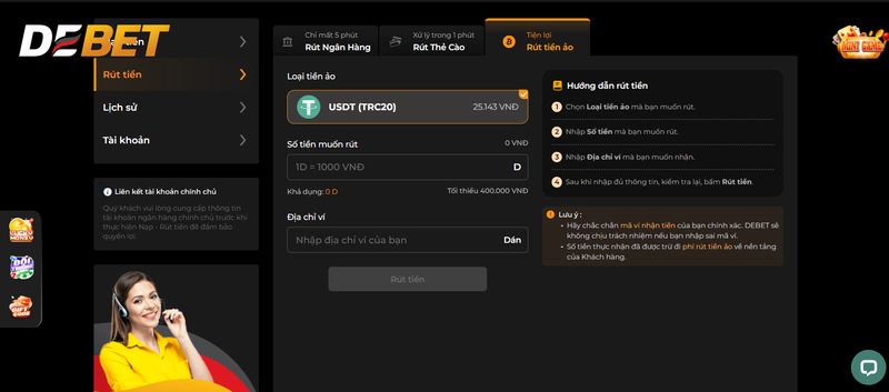 - Bước 3: Debet hỗ trợ nhiều phương thức rút tiền khác nhau để người chơi có thể linh hoạt lựa chọn. Ba loại hình phổ biến nhất bao gồm thẻ cào điện thoại, chuyển khoản ngân hàng, và cuối cùng là giao dịch tiền ảo.