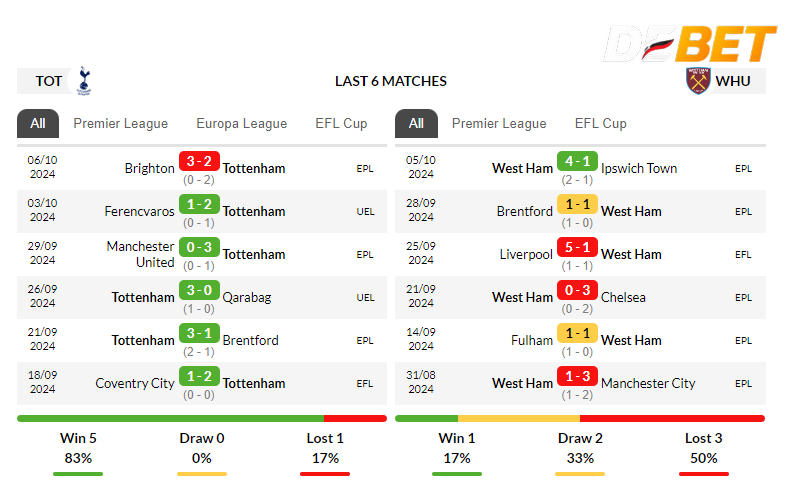 Phong độ thi đấu 6 trận mới nhất của Tottenham và West Ham