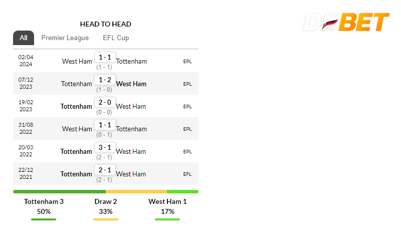 Thành tích đối đầu 6 trận mới nhất của Tottenham và West Ham